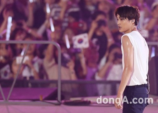 그룹 엑소의 카이가 15일 오후 서울 마포구 상암동 월드컵경기장에서 열린 대한민국 광복 70주년 국민대합창 ‘나는 대한민국’ 에서 화려한 무대를 꾸미고 있다.