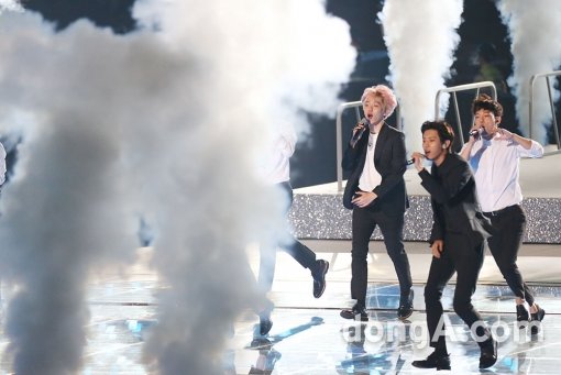 그룹 엑소가 15일 오후 서울 마포구 상암동 월드컵경기장에서 열린 대한민국 광복 70주년 국민대합창 ‘나는 대한민국’ 에서 화려한 무대를 꾸미고 있다.