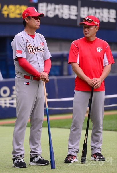SK 김용희 감독(왼쪽)은 팀 분위기 쇄신을 위해 조원우 주루·작전코치(오른쪽)를 수석코치로 임명하는 등 코칭스태프 보직 개편을 단행했다. 스포츠동아DB