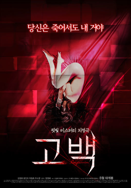 영화 ‘고백’이 공개한 심의 반려 포스터에서는 붉은 천 위에 전라로 웅크리고 누워있는 듯한 여자의 모습이 관객들의 시선을 사로 잡는다. 한껏 움츠린 그녀의 몸은 마치 무언가를 숨기고 있는 듯하며 상단에 위치한 “당신은 죽어서도 내 거야” 라는 강렬한 카피를 여자가 속삭이는 것처럼 보이기도 해 호기심을 더욱 자극한다.