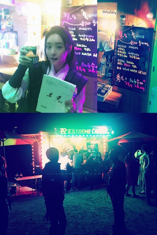 홍수아는 짙은 어둠 속 촬영장을 밝히는 형광등 미모를 자랑하며, “수아가 준비했수아”, “포졸팀 힘내세요” 라는 문구가 걸린 커피차 앞에서 환한 미소를 지은 사진으로 고마운 마음을 전했다.