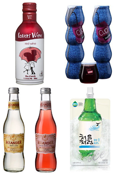 주류업계가 아웃도어족을 위해 야외 활동에 적합한 형태의 제품을 선보였다. 와인을 캔에 담은 ‘러버스와인’과 컵4개가 이어진 패키지 ‘컵 스택와인 ’, 얼릴 수 있는 ‘순하리 유자 파우치’, 1∼2잔 분량의 ‘미안더’(왼쪽상단부터 시계방향으로).