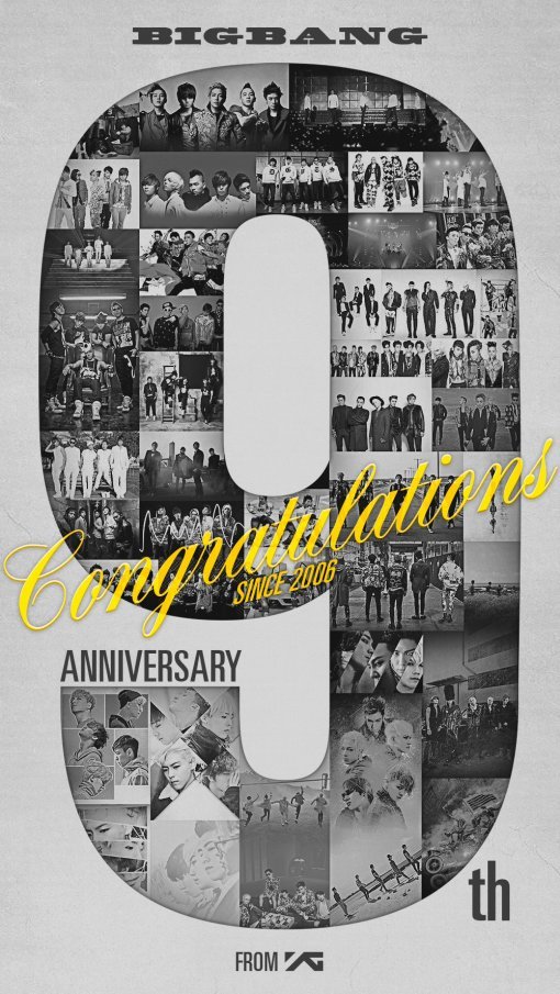 공개된 이미지에는 ‘BIGBANG 9th ANNIVERSARY’라는 문구와 함께 빅뱅을 상징하는 노란색 글씨로 ‘Congratulations SINCE 2006’이라고 새겨져 있다. 또 초대형 숫자 ‘9’안에는 그간 빅뱅이 발표한 앨범 재킷 이미지 등이 고스란히 담겨있어 지난 9년간의 추억들을 새록새록 떠올리게 했다.