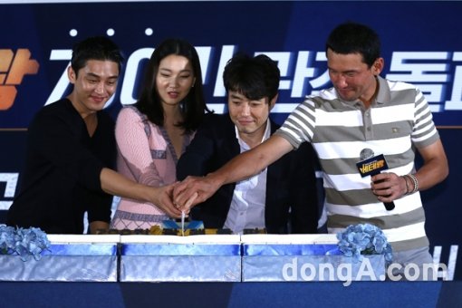 배우 유아인(왼쪽부터), 장윤주, 류승완 감독, 황정민이 19일 오후 서울 영등포구 영등포CGV에서 열린 영화 '베테랑' 700만 돌파 관객 감사 이벤트 행사에 참석해 포토타임을 하고 있다.