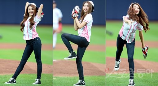 19일 수원 kt위즈파크에서 ‘2015 타이어뱅크 KBO리그’ kt 위즈와 넥센 히어로즈의 경기가 열렸다. 걸그룹 베리굿의 세형이 시구를 던지고 있다.