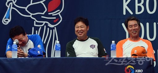 19일 경기도 연천 고대산 베이스볼파크에서 ‘레전드 BIG3와 함께 하는 2015 KBO 유소년 야구캠프’가 열렸다. 선동열, 이만수, 김시진 전 감독(왼쪽부터)이 Q&A 시간에 선수들의 질문을 듣고 환하게 웃고 있다. 연천|김진환 기자 kwangshin00@donga.com