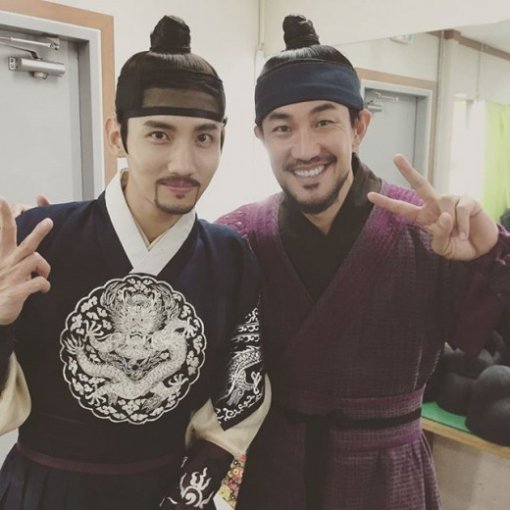 이날 공개된 사진에는 MBC 수목드라마 ‘밤을 걷는 선비(이하 밤선비)’ 촬영장으로 보이는 곳에서 심창민과 한정수가 다정한 모습으로 카메라를 응시하고 있다.