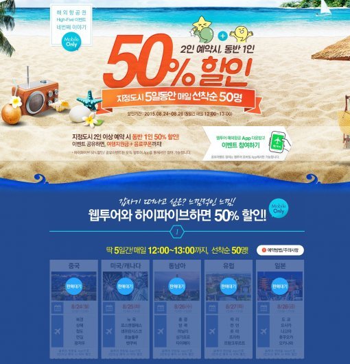 온라인 웹투어는 8월에 해외항공권을 구매하려는 고객들을 대상으로 반값에 해외 항공권을 구매할 수 있는 ‘하이 파이브’ 이벤트를 24일부터 28일까지 진행한다.