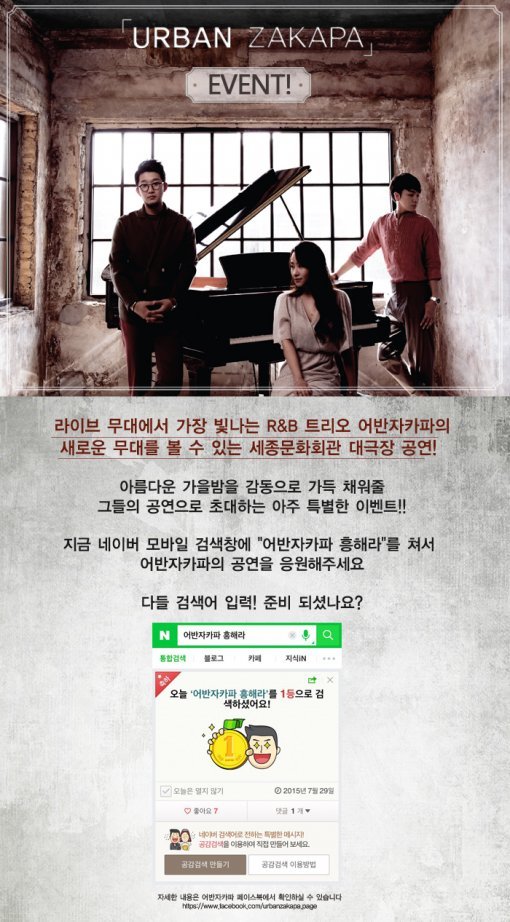 현재 페이스북으로 60만에 가까운 팬 수를 보유하고 있는 어반자카파는 포털 사이트 네이버와 함께 '어반자카파 흥해라'라는 키워드로 검색어 이벤트를 진행할 예정인 것으로 알려졌다.