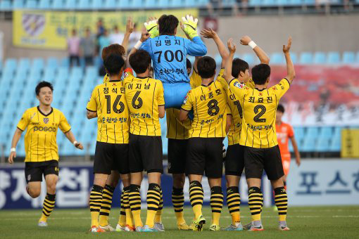 전남 드래곤즈 이종호가 ‘가마꾼’ 세리머니를 선보이는 모습. 사진제공|한국프로축구연맹