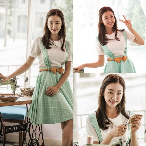21일 공개된 사진에서 고원희는 블라우스와 옥색 원피스, 오렌지색 벨트가 어우러진 복고 의상을 입고 있다. 복고풍에도 미모는 여전히 청순하다.