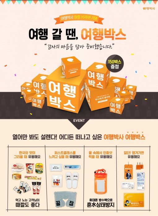 창립 기념 이벤트를 위해 특별 제작한 여행박스는 여행에 필요한 각종 용품으로 구성한 파우치다. 비행기 안에서 유용한 목베개와 슬리퍼, 칫솔치약 세트, 소음방지 이어플러그, 물티슈와 여행지에서 비상식량으로 쓸수 있는 햇반, 컵라면, 볶음고추장과 통조림 반찬, 스틱커피 등을 갖추고 있다. 해변이나 수영장이 있는 휴양지에서 필요한 휴대폰 방수팩과 면세점 할인쿠폰, 캐리어 네임택, 110볼트용 멀티탭도 있다.