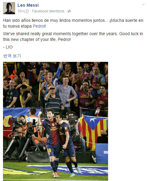 그의 이적이 확정되자 메시는 21일 자신의 페이스북에 “지난 수 년간 페드로와 정말 좋은 순간을 함께 했다. 새로운 무대에 행운이 있길 바란다. 페드로!”라는 글과 함께 두 사람이 함께 담긴 사진을 남겼다.
