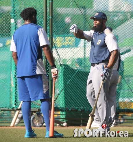 21일 오후 대구야구장에서 열리는 ‘2015 타이어뱅크 KBO 리그 프로야구’ 삼성 라이온즈 대 NC 다이노스 경기에 앞서 삼성 나바로와 NC 테임즈가 얘기를 나누고 있다.