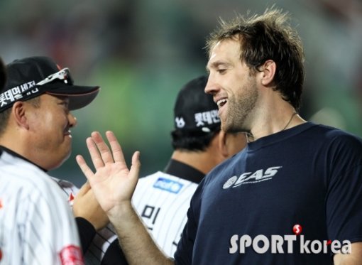 린드블럼이 경기를 마치고 주형광 투수코치와 하이파이브를 나누고 있다.