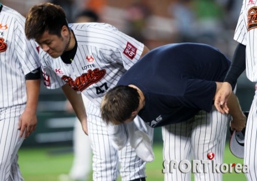 린드블럼이 경기를 마치고 강민호와 함께 팬들에게 인사를 하고 있다.