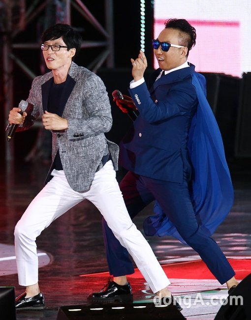 유재석, 박명수가 12일 오후 강원도 평창군 알펜시아리조트에서 열린 MBC '2015 무한도전 가요제 영동고속도로가요제'(이하 무한도전 가요제)에 참석해 공연을 하고 있다.