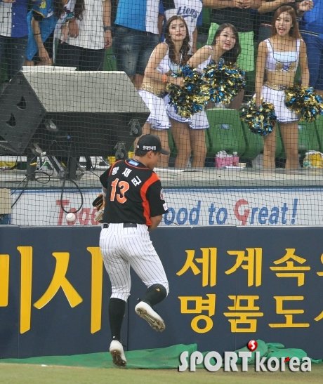 23일 오후 대구야구장에서 열린 ‘2015 타이어뱅크 KBO 리그 프로야구’ 삼성 라이온즈 대 롯데 자이언츠 경기 1회말 2사 2루에서 삼성 최형우의 파울타구를 롯데 3루수 황재균이 놓치고 있다.