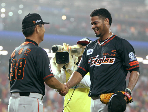 한화 김성근 감독(왼쪽)이 새 외국인투수 에스밀 로저스를 선동열과 비교하며 극찬했다. 김 감독이 22일 광주-기아 챔피언스필드에서 열린 KIA전에서 9이닝 무실점으로 완봉승을 거둔 로저스와 악수하고 있다. 사진제공|스포츠코리아
