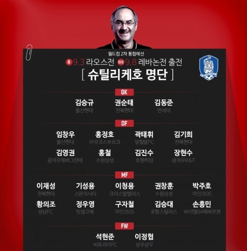 울리 슈틸리케 감독이 이끄는 대한민국 축구국가대표팀이 ‘2018 러시아 월드컵’ 2차 예선 라오스, 레바논 전에 나설 23인의 대표팀 명단을 공개했다.