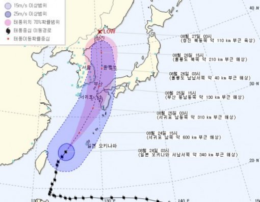 비는 25일 낮 제주도를 시작으로 밤에는 충청과 남부 지방의 비도 대부분 그치겠으나, 중부지방은 26일 낮쯤에 태풍의 영향권에서 벗어날 것으로 보인다.