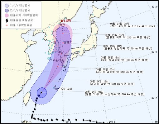 26일 자정까지 예상 강수량은 강원도영동·경상남북도·제주도·울릉도·독도 100~200mm, 전남남해안·경북서부내륙 50~150mm, 강원도영서·충청북도·전라남북도 20~60mm, 서울·경기도·충청남도·서해5도 10~40mm 내외다.