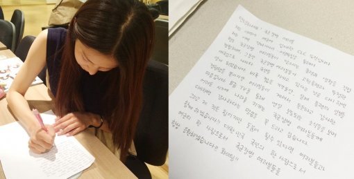 지난 26일 저녁 큐브엔터테인먼트는 씨엘씨 공식 SNS를 통해 “진짜사나이 여군특집을 경험하며 철이 든 유진 양! 국군장병 분들께 감사의 마음을 전하고자 손편지를 썼습니다”라는 내용과 함께 두 장의 사진을 공개했다.