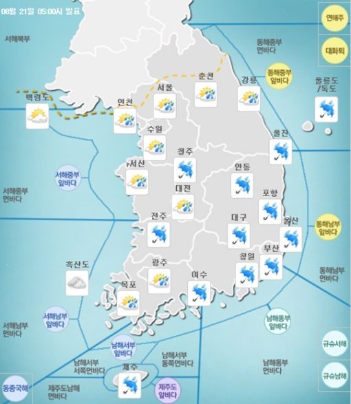 이날 아침 예상 최저기온은 서울 20도, 대전 19도, 부산 22도, 대구 20도, 광주 20도 등이며, 낮 예상 최고기온은 서울 26도, 대전 27도, 부산 28도, 대구 28도, 광주 28도 등이다.