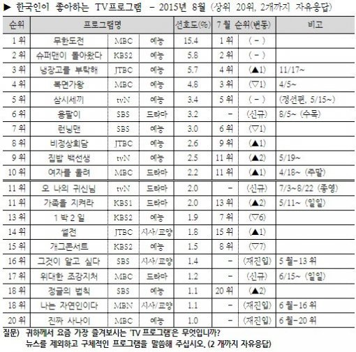 한국갤럽이 8월 18일부터 20일까지 3일간 전국 만 19세 이상 남녀 1,003명에게 요즘 가장 즐겨보는 TV프로그램을 물은 결과(2개까지 자유응답), MBC 토요 예능 ‘무한도전’이 선호도 15.4%로 11개월 연속 1위를 지켰다.
