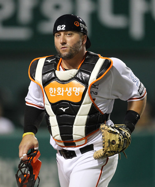 3-8로 뒤진 5회말 2사 1·2루. 이번에는 정범모 타석에서 대타 정현석이 기용돼 삼진으로 물러났다. 이날 엔트리에 있던 한화 포수 2명 모두가 교체된 상황. 누가 마스크를 쓸지 관심이 쏠리는 순간, 폭스가 포수 장비를 갖추고 나와 6회초부터 안방에 앉았다.