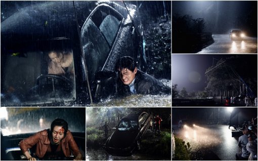 칠흑 같은 어둠속에 촬영중인 제작진의 모습도 관심을 끈다. 각종 크레인을 포함한 수많은 장비가 보인다. 폭우 속 좁은 시골길을 위태롭게 달려야하는 장면과 저수지 신 촬영에 혼신의 힘을 쏟고 있다.