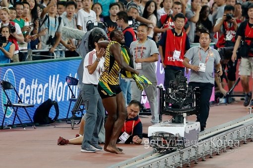 이륜 바이크를 탄 채 우사인 볼트와 함께 넘어진 카메라맨은 다급하게 볼트의 상태를 확인했다. 우사인 볼트는 다리를 절뚝거리며 일어났지만 다행히 부상은 아닌 것으로 전해졌다.