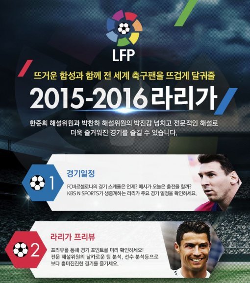 라리가는 38라운드 총 228경기를 국내 단독 생중계 될 예정이며 메시, 수아레스, 호날두, 네이마르 등 세계 최고의 프로축구 선수들이 활약하는 리그로 유럽축구연맹(UEFA) 리그 랭킹에서 압도적인 1위를 차지하고 있다