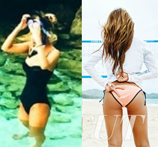 공개된 사진에는 효린과 유빈의 수영복 몸매를 비교 놓았다. 두 사람 모두 탄력있는 몸매 라인을 자랑한다. 특히 가슴 라인을 훤히 드러낸 효린과 애플힙을 자랑하는 유빈의 뒤태가 시선을 사로 잡는다.