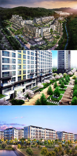 테라스 하우스가 아파트의 편리성과 단독주택의 여유로운 공간을 동시에 누릴 수 있다는 장점이 부각되면서 분양시장서 인기가 높다. 전 가구에 테라스를 갖추고 최상층은 다락과 테라스가 동시에 있는 복층형으로 구성한 ‘광교 파크자이 더 테라스’, 층과 면적에 따라 특화된 설계를 자랑하는 ‘세종시 3차 모아엘가 더 테라스’, 9월 초 분양 예정인 인천 논현 ‘한양수자인 아르디에 테라스’(맨 위쪽사진부터)