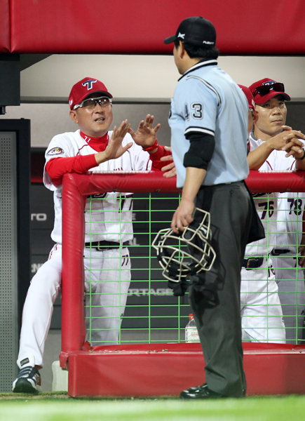 KIA 김기태 감독(왼쪽)이 30일 광주 넥센전에서 보복성 사구에 대해 김성철 구심이 주의를 주자 반박하고 있다. 사진제공|스포츠코리아