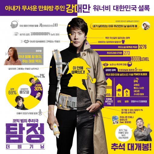 이번에 공개된 ‘강대만’의 캐릭터 인포그라피는 트렌치 코트로 멋을 낸 탐정다운 모습과, 포대기를 걸치고 젖병을 쥔 공처가의 모습이 강렬한 대비를 이루어 큰 웃음을 자아낸다. 더불어 “아내 말을 잘 듣자, 주는 대로 먹자”라는 그의 좌우명과 “아내 몰래 만화방 탈출 잔머리 지수 183”, “아내와 말싸움에도 끄떡없는 주둥이” 등 ‘강대만’을 대표하는 톡톡 튀는 문구들은 전형적인 공처가의 모습을 대변하고 있어 캐릭터에 대한 재미를 더한다.