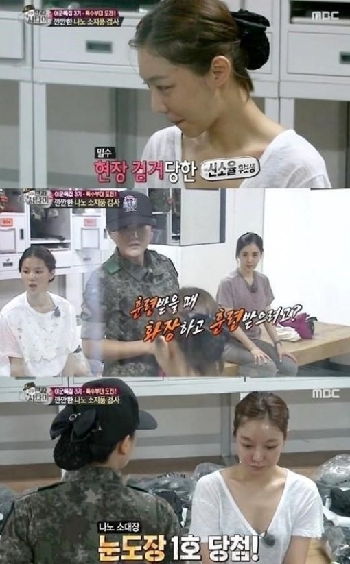 ‘진짜 사나이’ 신소율이 몰래 숨겨온 화장품을 들켰다.