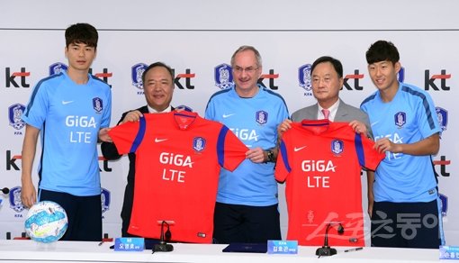 조인식에는 KFA를 대표해 김호곤 부회장, 울리 슈틸리케 대표팀 감독, 기성용(스완지시티), 손흥민(토트넘)이 참석했고, KT에선 오영호 홍보실장이 함께했다. 이번 계약을 통해 KT는 축구국가대표팀 의류 광고권과 에스코트 키즈 운영권 등 독점 후원권리를 연장했고, KFA가 주최하는 대표팀 경기시 A보드 광고권, 대표팀을 활용한 자사 광고권 등 공식후원사에 주어지는 다양한 권리를 계속 누릴 수 있게 됐다.