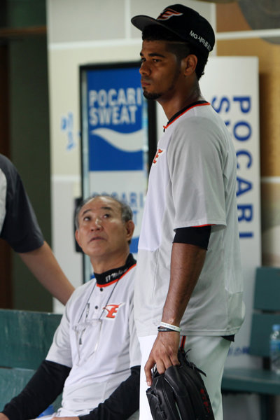 한화 니시모토 다카시 투수코치(왼쪽)가 1일 청주구장에서 열린 KIA전에 앞서 외국인투수 에스밀 로저스와 면담을 했다. 로저스는 압도적 피칭뿐 아니라 경기 전 타자들을 제쳐두고 타격훈련을 하는 등 기행으로 팀 안팎에서 주목을 받고 있다. 사진제공|스포츠코리아