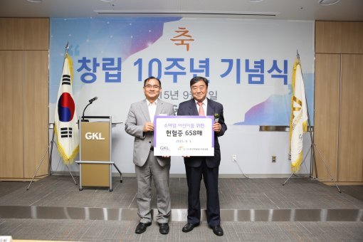 그랜드코리아레저(이하 GKL)은 창립 10주년을 맞아 1일 열린 기념식에서 헌혈증 1316 매를 한국백혈병소아암협회와 한국백혈병어린이재단에 전달했다.