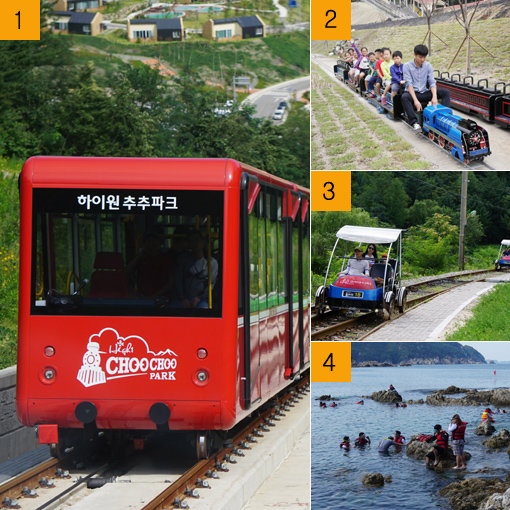 1-‘정태영삼 버스’ 삼척·태백 노선의 관광명소 하이원추추파크에서 경험할 수 있는 국내 유일의 스위스식 산악열차 인클라인 트레인. 1963년 철거된 강삭철도를 복원해 표고차 200m, 15.6도의 경사구간을 오르내린다. 2-세계 유명 열차를 미니어처로 만들어 직접 탑승할 수 있는 하이원추추파크의 미니트레인. 3-7.7km의 코스를 자랑하는 하이원추추파크 레일바이크. 다양한 테마로 꾸며진 12개의 터널을 지나는데, 경사진 철길을 내려오면서 국내 레일바이크 중 최고 속도를 체험할 수 있다. 4-아기자기한 풍경이 예쁜 동해 장호어촌체험마을에서 스노클링 체험을 하는 관광객들.