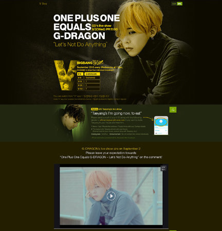 멤버별 개성을 살려 각기 다른 콘셉트로 진행하는 V LIVE는 2일부터 5주간 매주 수요일 오후 11시에 방송된다. 시작은 리더인 지드래곤의 ‘일 더하기 일은 지용이-우리 아무것도 하지 말아요’로 팬들과 영상 통화하듯 편안하게 소통하는 모습을 보여줄 예정이다. 한편 네이버는 7월31일 베타서비스를 출시한 뒤 기술 고도화와 서비스 안정성에 주력해왔다. 그동안 누적 재생 수는 8700만건, 팬들이 스타에게 날린 하트 수는 누적 4억6000만개에 이른다. 스타 라인업도 틴탑과 박보영, 마마무 등 47개로 확대했다.