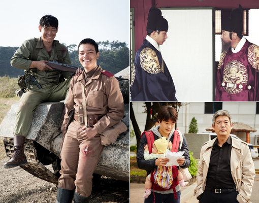 가을은 ‘남자’의 계절이다. 추석을 앞둔 극장가에 ‘남남 커플’들이 줄지어 기다리고 있다. ‘서부전선’의 설경구·여진구, ‘사도’의 송강호·유아인, ‘탐정 :더 비기닝’의 성동일·권상우(왼쪽부터 시계방형으로). 사진제공|타이거픽쳐스·하리마오픽쳐스·크리픽쳐스