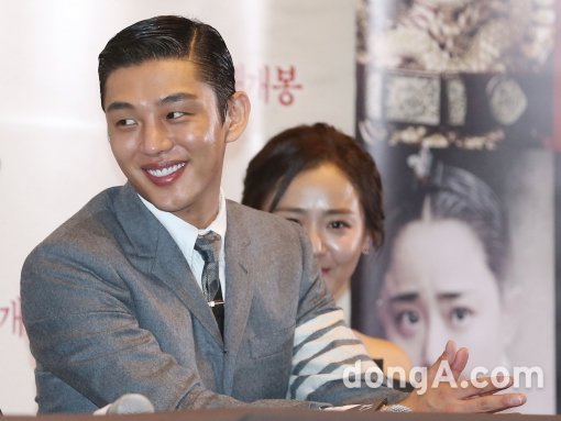 배우 유아인(왼쪽))이 3일 오후 서울 강남구 코엑스에서 열린 영화 ‘사도’ 언론시사회에 참석해 미소짓고 있다.