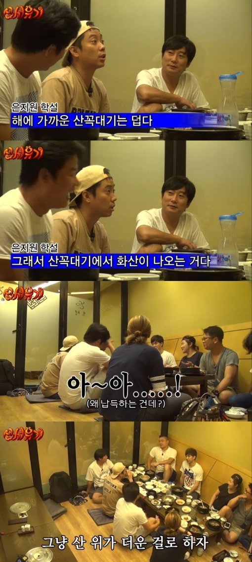 이후 이들의 논쟁은 고산지대의 날씨 이야기로 번졌다. 강호동은 만년설을 언급하며 높은 산의 정상은 춥다는 논리를 폈지만 은지원은 "태양에 더 가까이 있으니까 더울 것이다. 그래서 산꼭대기에서 화산이 일어나는 것이다"라는 어이없는 논리를 펴 시청자들의