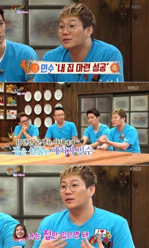 3일 방송된 KBS 2TV ‘해피투게더 시즌3'(이하 해피투게더3)에서 윤민수는 어린 시절 결혼해 고생한 아내에게 집을 선물했다고 말해 시선을 모았다.
