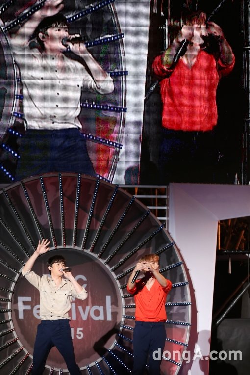 그룹 2PM의 닉쿤(왼쪽)과 준호가 5일 오후 서울 마포구 MBC 사옥 앞에서 열린 DMC페스티벌 K-POP 슈퍼콘서트에서 공연을 꾸미고 있다.