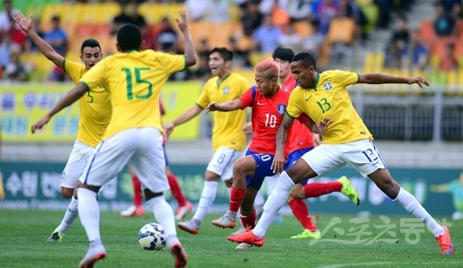 17세 이하 청소년대표팀 이승우(10번)가 6일 수원월드컵경기장에서 열린 2015수원컨티넨탈컵 브라질전 도중 상대 수비를 뚫고 공격을 시도하고 있다. 수원|김종원 기자 won@donga.com