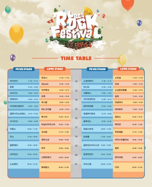 타임테이블은 러브 스테이지와 피스 스테이지 총 2개의 무대로 나뉘어져 있는 가운데 러브 스테이지는 어쿠스틱하고 모던한 음악의 아티스트들로, 피스 스테이지는 신나고 락 스피릿이 충만한 아티스트들로 구성되어 있다.